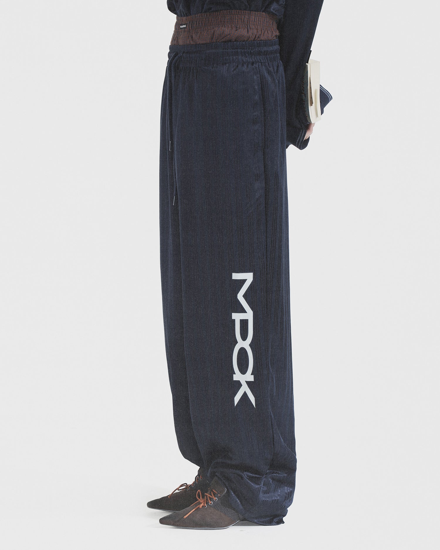 - High-waisted elastic straight-leg pants with drapey dark stripes and a glossy finish