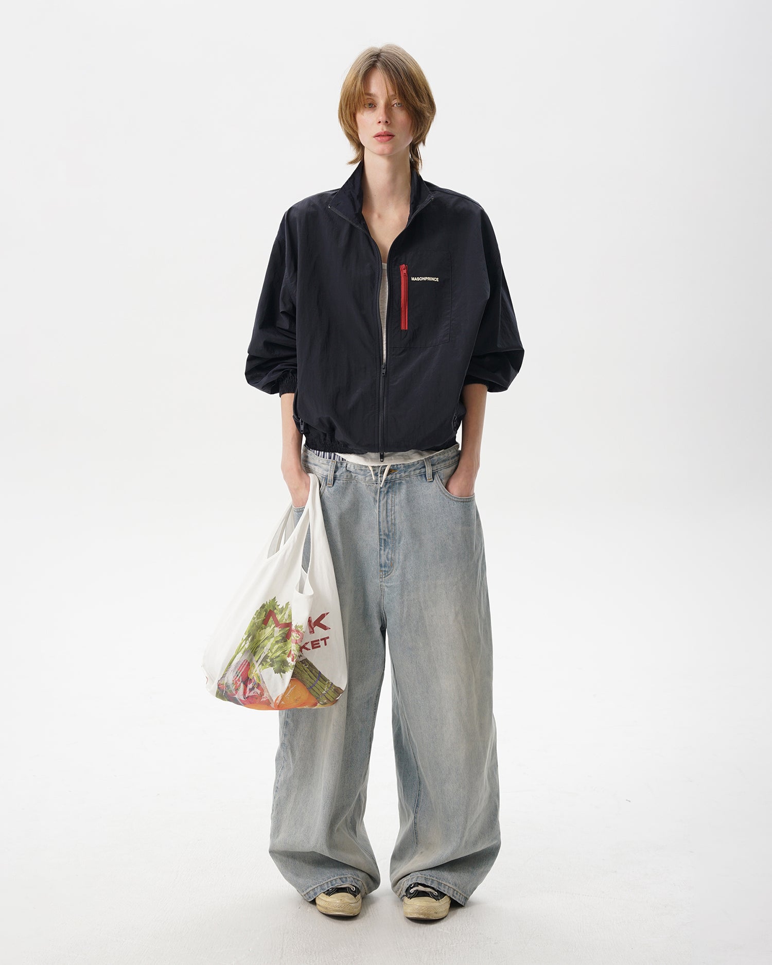 We recommend choosing one size smaller for a regular fit, as the model is styled in a larger size to achieve an artistic effect.