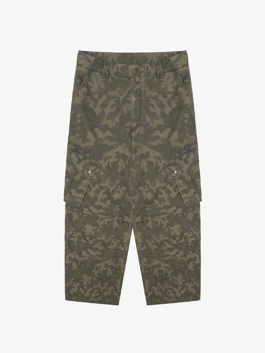 Relaxed paratropper fit Custom camouflage dark check fabric Adjustable cotton cord at waist Garment aging...