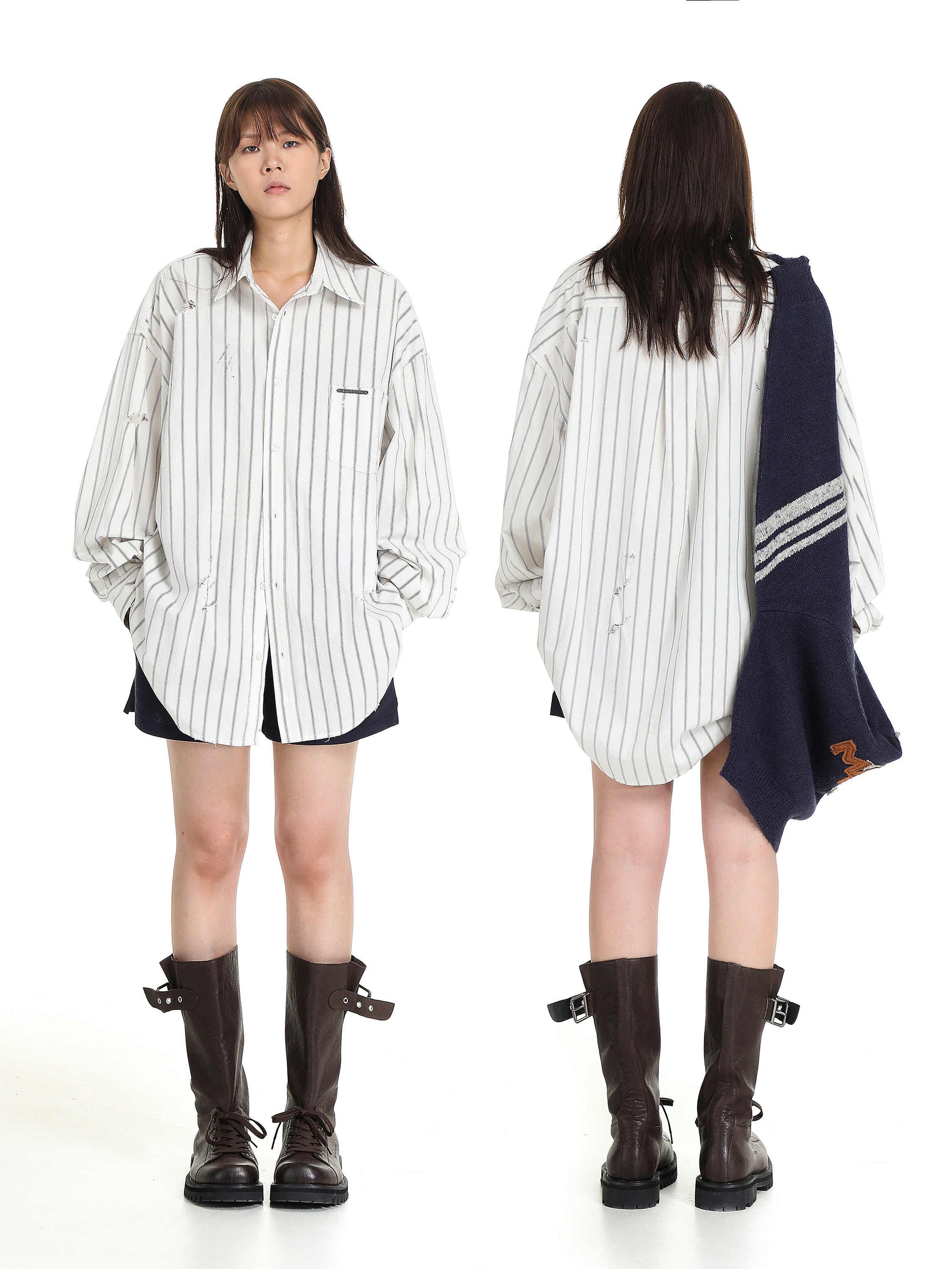 We recommend choosing one size smaller for a regular fit, as the model is styled in a larger size to achieve an artistic effect.